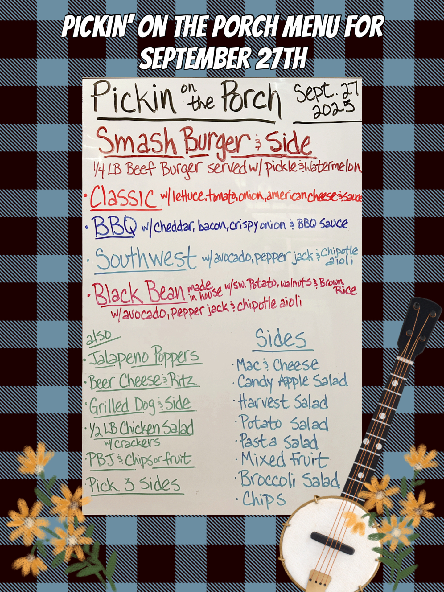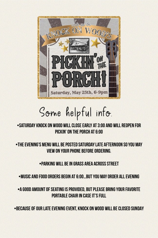 PLEASE NOTE: WE CLOSE ON SUNDAY FOLLOWING PICKIN’ ON THE PORCH EVENINGS!